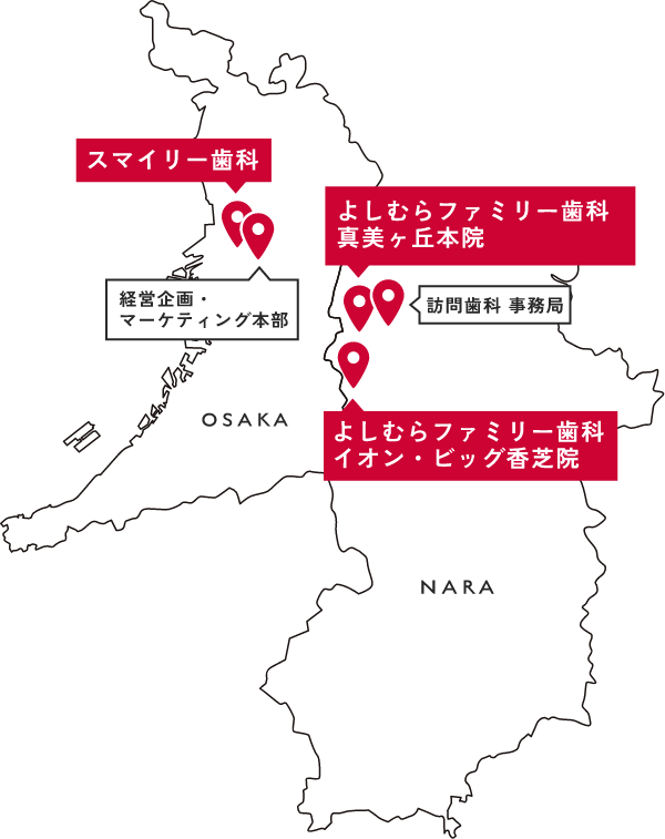 3つの歯科医院のほかに、2つの訪問歯科、経営企画・マーケティング本部・事務局を展開しています。